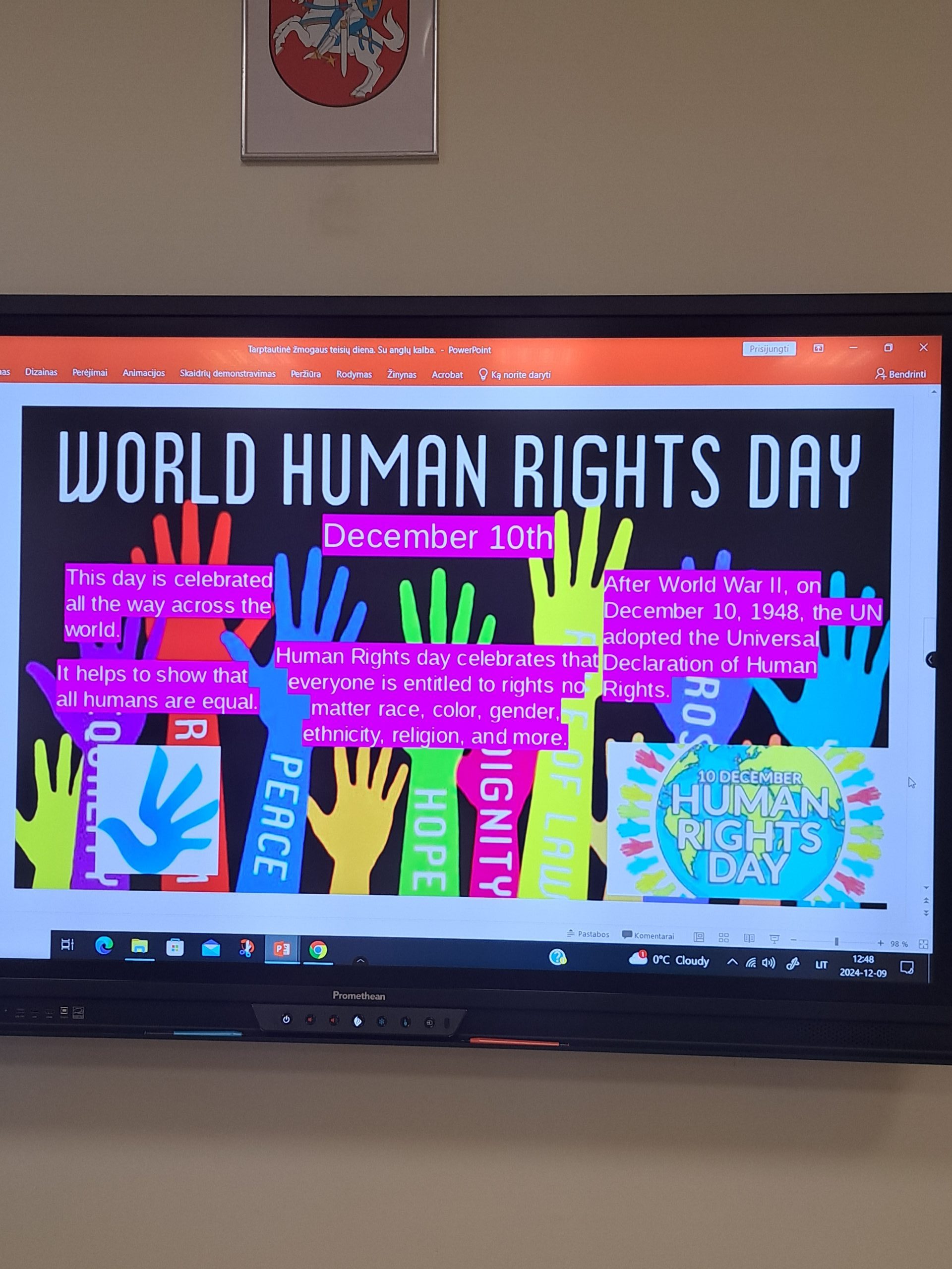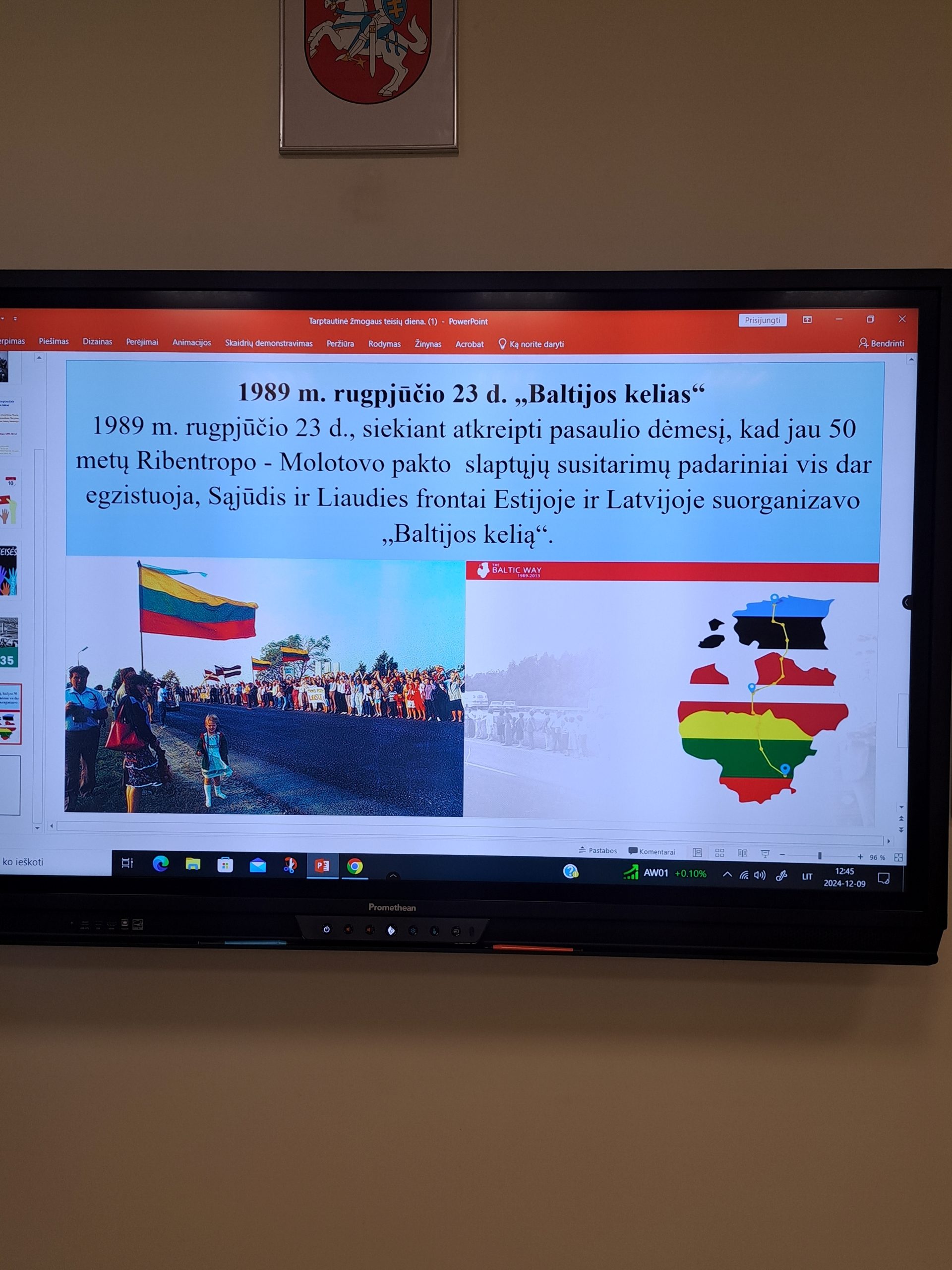 Gruodžio 10-oji Tarptautinė žmogaus teisių diena. Šiai svarbiai dienai paminėti lietuvių, anglų ir istorijos mokytojos gruodžio 9 d. II A klasei organizavo integruotą pamoką. Pamokos metu mokiniai prisiminė, kokios yra žmogaus teisės, kartu su istorijos mokytoja aptarė Visuotinę žmogaus teisių deklaraciją bei kaip didžiausią protesto akciją prieš nusižengimą žmogaus teisėms Baltijos kelią (šiais metais minima Baltijos kelio 35 metų sukaktis). Anglų mokytoja mokiniams skyrė užduotį atlikti vertimą iš lietuvių į anglų kalbą apie Baltijos kelio akciją bei surasti nuorodas, kokie užsienio šalių dienraščiai tuo metu rašė apie šią protesto akciją. Pamokos pabaigoje gimnazistai skaitė eilėraščius, skirtus Baltijos keliui, analizavo jų meninę kalbą, aiškinosi prasmę. Skirtos užduotys mokiniams padėjo ugdyti įvairias kompetencijas: komunikavimo, kultūrinę, skaitmeninę, kūrybiškumo, pažinimo, pilietiškumo, taip pat kėlė jų pilietinį sąmoningumą bei skatino patriotiškumą.
