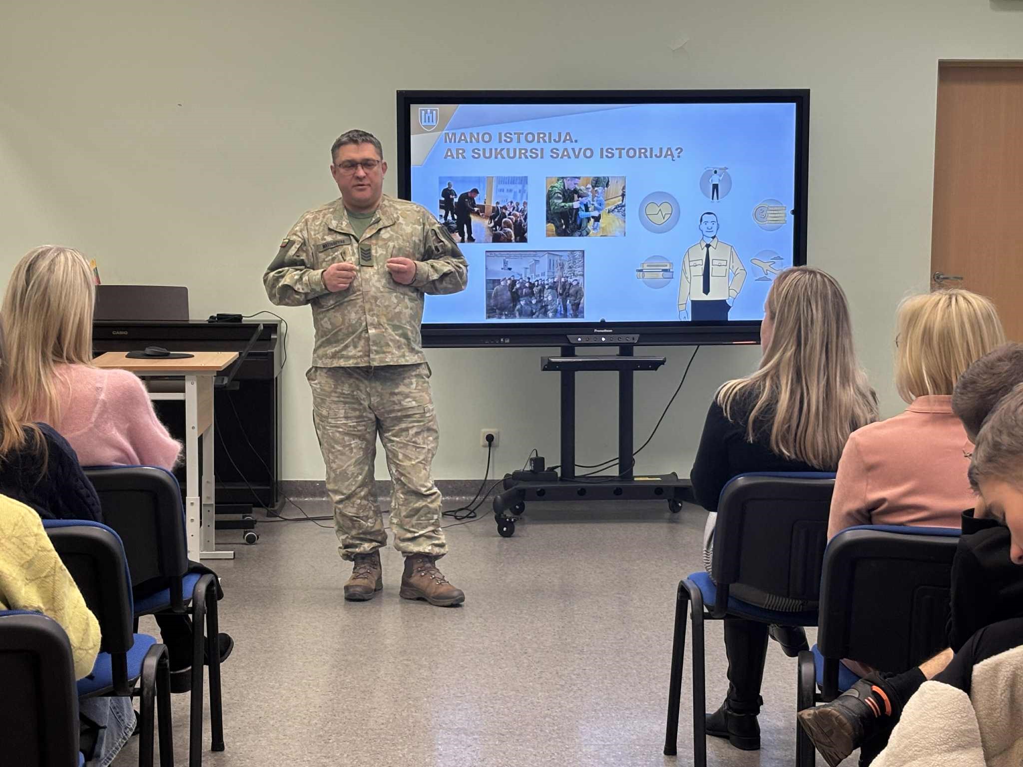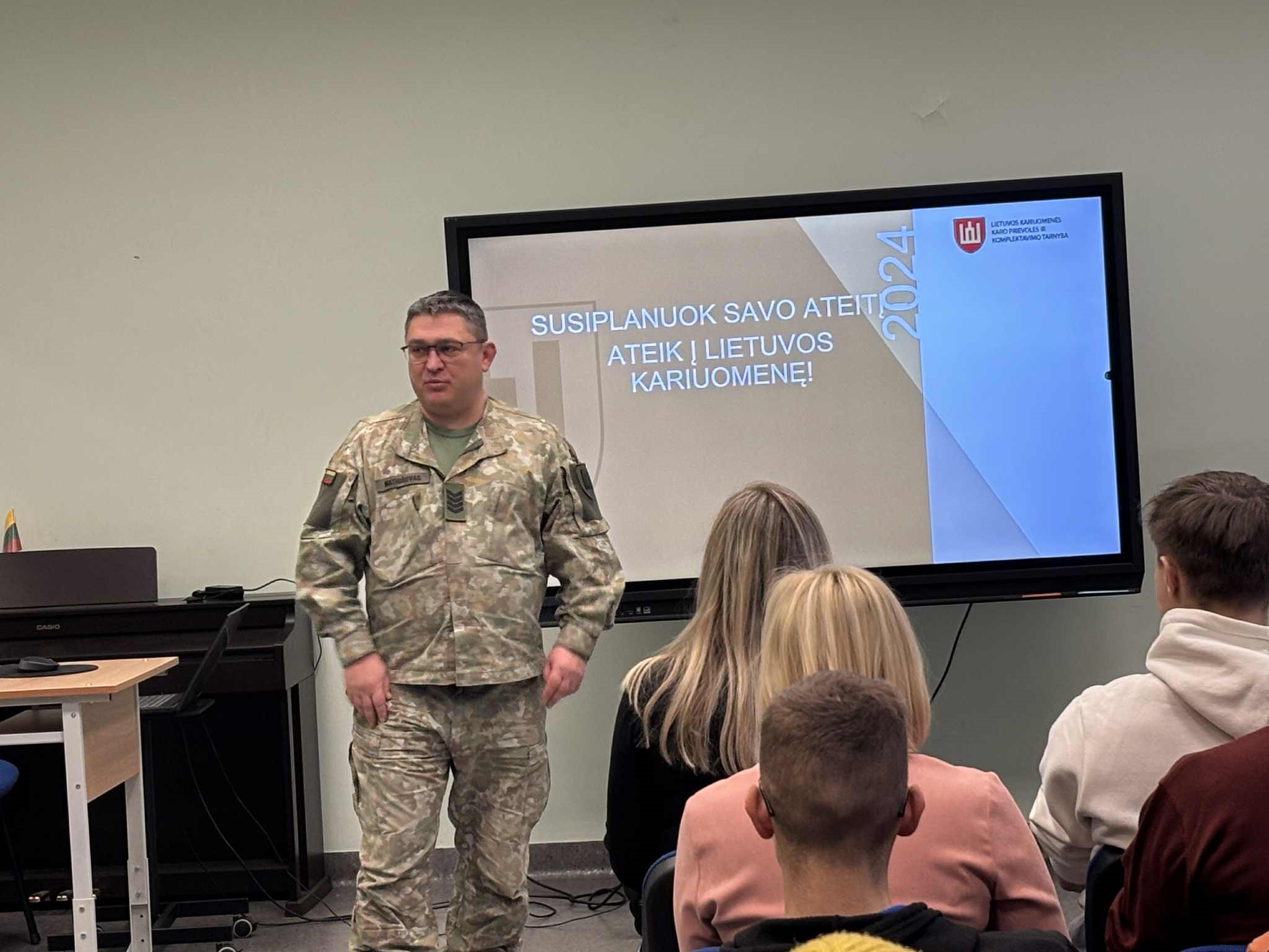 Gruodžio mėnesio pradžioje gimnazijoje įvyko Lietuvos valstybės kariuomenės dienos minėjimas. Tradiciškai buvo pasikviestas seržantas, kuris papasakojo apie privalomąją karo tarnybą, šauktinių sąrašų formavimą bei šios srities naujoves, kariūnas taip pat pakomentavo įvairias galimybes atlikti karo tarnybą: savanoriška nenuolatinė karo tarnyba, savanoriška karo tarnyba. Gimnazijos mokiniams aktualiausia buvo sužinoti, kas gi laukia, jei šauktinis turi atlikti karo tarnybą: vieta, trukmė, pobūdis, išmokos … Į šiuos ir daugelį kitų klausimų atsakė tiek ir privalomosios karo tarnybos atstovas, tiek ir tik ką savanoriškąją karo tarnybą pabaigęs karys Danielius Černevič, šiuo metu sėkmingai studijuojantis VU. Danielius papasakojo, kad tarnyba ne tik kad pakeitė jo požiūrį į gyvenimą ir jį supančius žmones, bet ir padėjo patį save geriau pažinti bei užsigrūdinti.