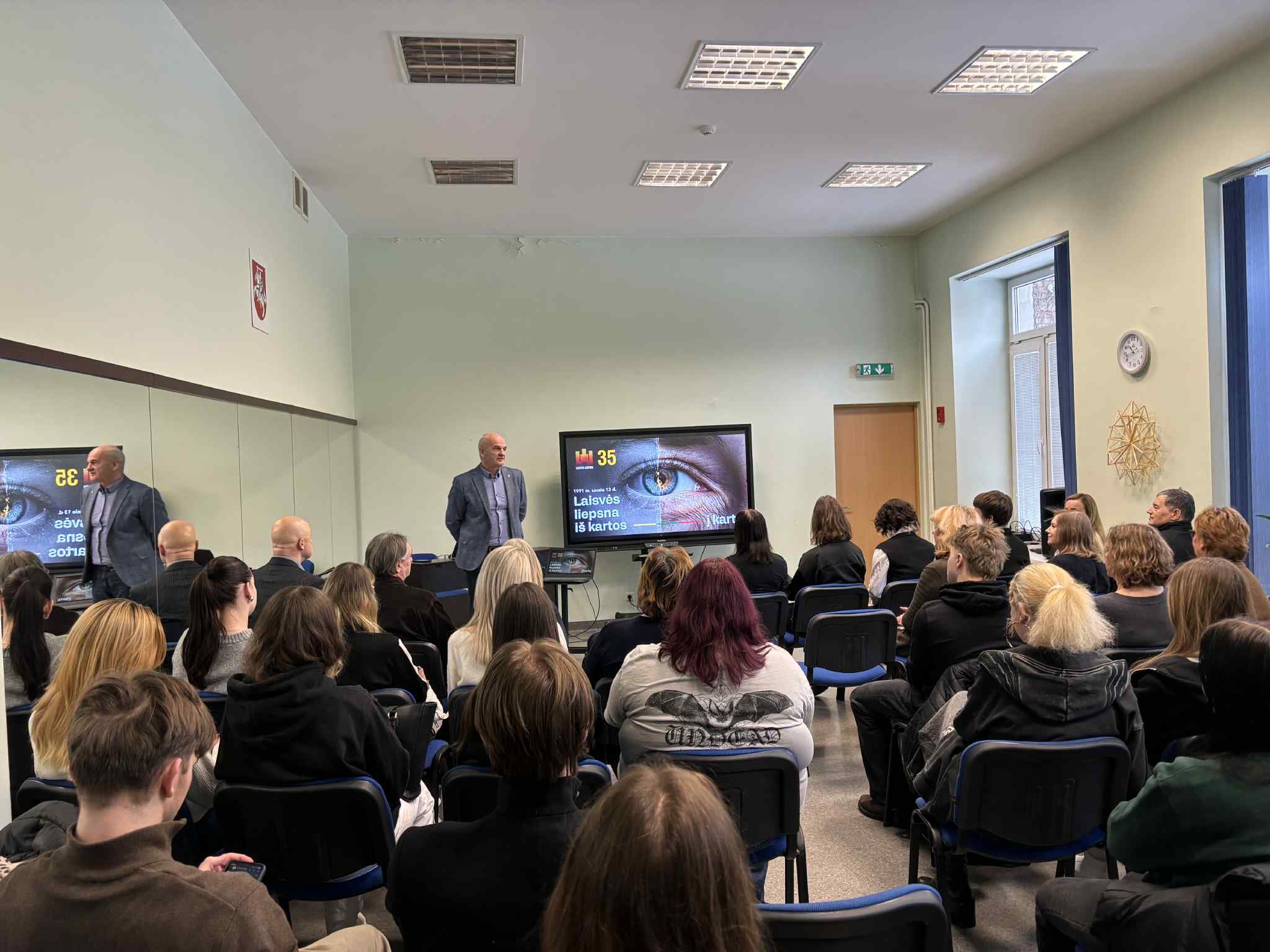 Laisvės gynėjų dienos 35-mečio minėjimą pradėjome pilietine akcija „Pergalės šviesa“ – dešimčiai minučių uždegėme vienybės, atminties ir pergalės žvakutes. Trečios pamokos metu vyko renginys „Pamoka Laisvei“, kurio metu gimnazijos direktorius priminė, kad tai viena iš svarbiausių modernios Lietuvos istorijos datų, kuri kalba apie mūsų valstybės, mūsų tautos valstybingumo gynybą, kai sovietų ginkluotoms pajėgoms šturmuojant Vilniaus televizijos bokštą, Lietuvos televizijos ir radijo būstinę žuvo keturiolika ir buvo sužeista daugiau kaip pusė tūkstančio beginklių civilių gyventojų. Laisvės gynėjų dienos reikšmė dar labiau išaugo Rusijos pradėto karo prieš Ukrainą akivaizdoje. Šis karas privertė mus iš naujo įvertinti laisvės, pasiaukojimo, gynybos, pasirengimo pasipriešinimui prasmę. Renginio dalyviai per LRT stebėjo nuotolinę „Pamoką Laisvei“, o minėjimą vainikavo bendruomenės atliekama daina „Laisvė“, tapusi vienybės ir istorinės atminties simboliu.