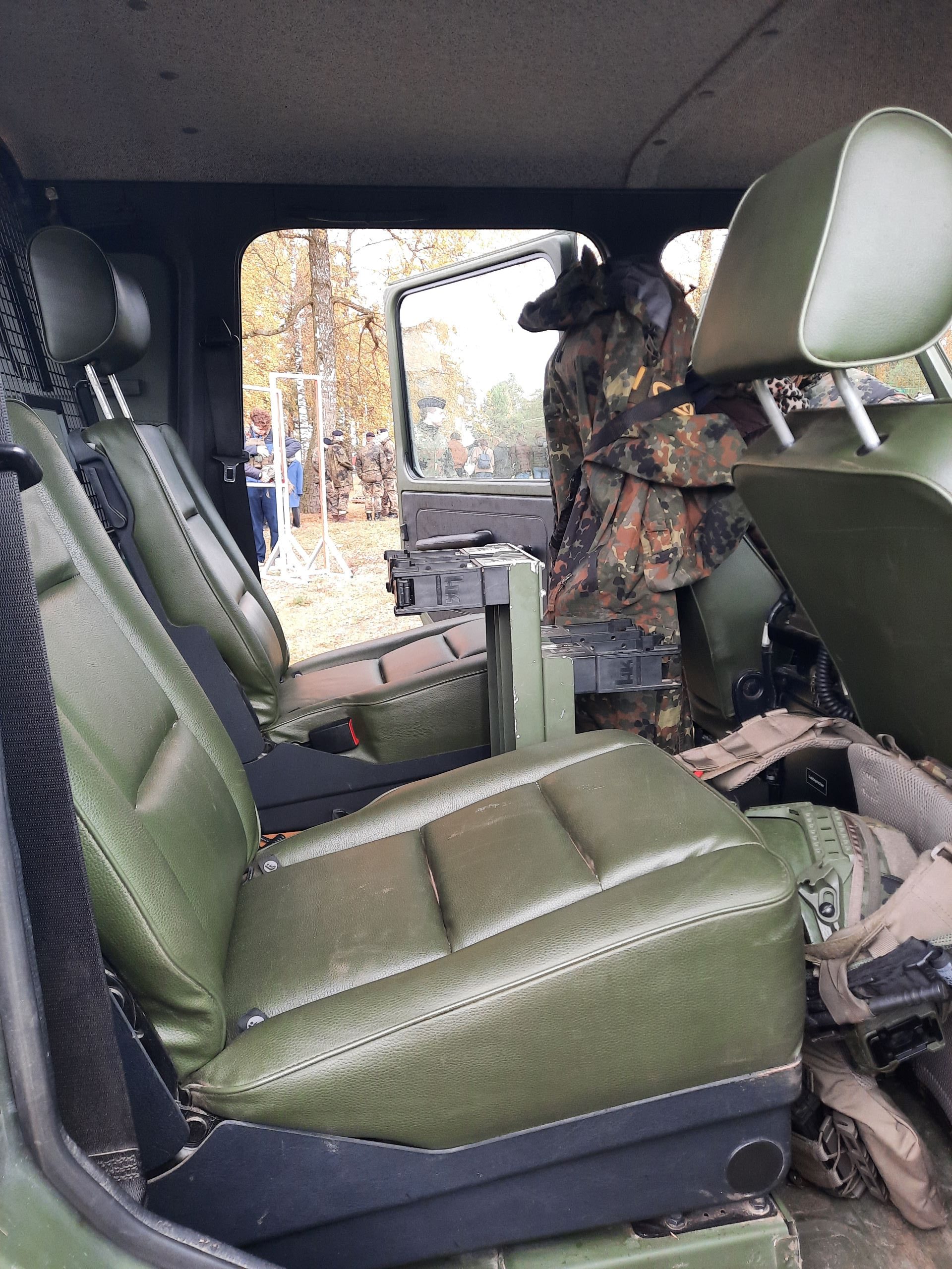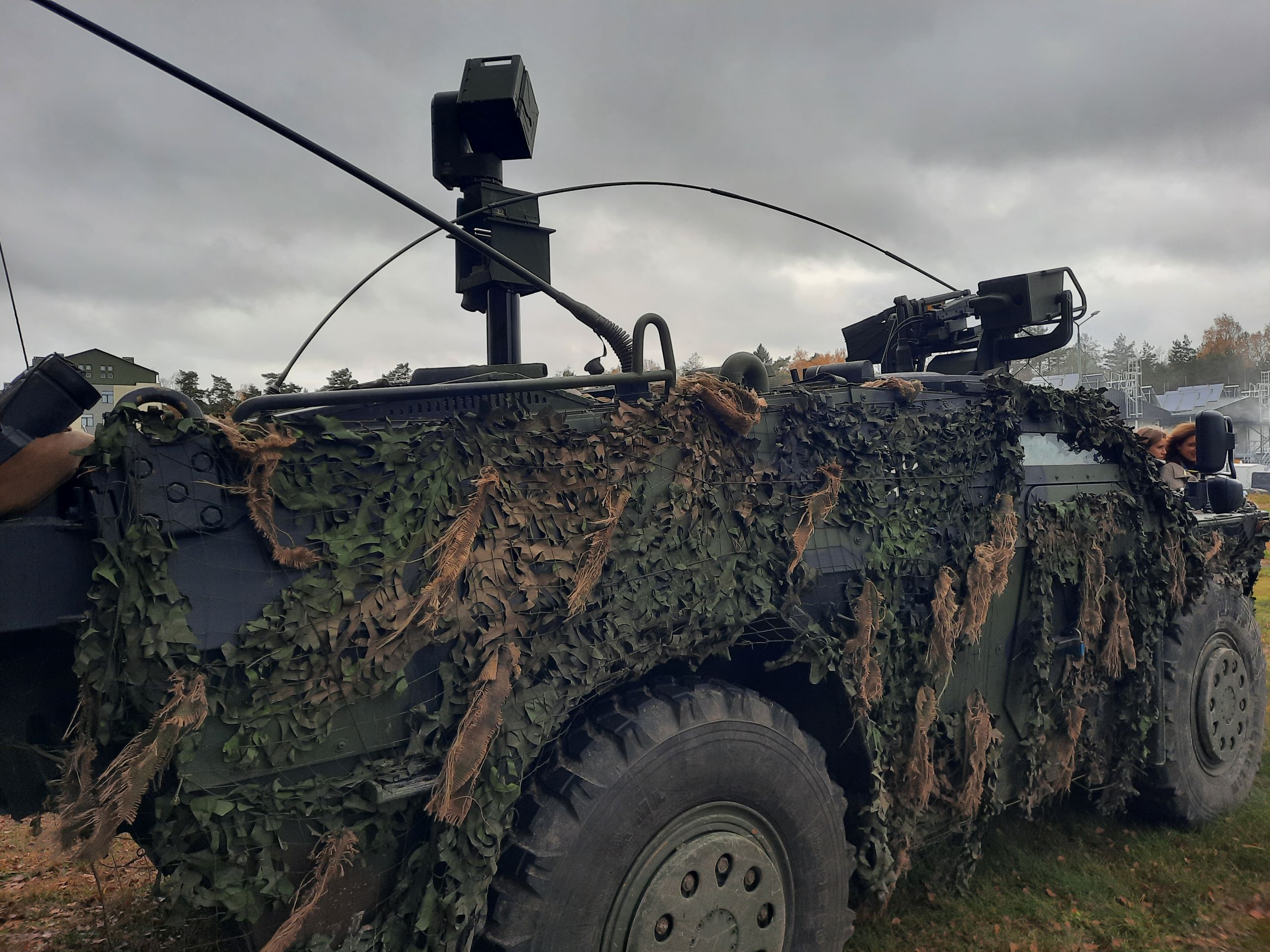 Žinoma, nevalia nepasimatuoti kareiviškos amunicijos: kuprinė priekyje, kuprinė ant nugaros, šalmas. Kadangi jis sveria kone penkis kilogramus, tampa sunku net stovėti. Teko ne tik sunkias karių kuprines pakilnoti bei pasimatuoti, bet ir apžiūrėti dronus, šautuvus, pistoletus.