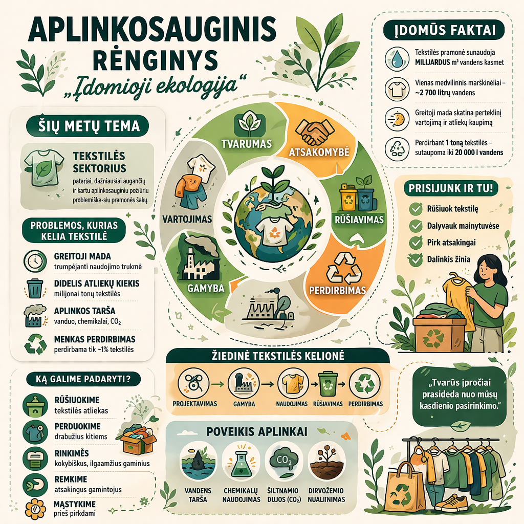 Šiais metais Žemės dieną paminėjome dalyvaudami aplinkosauginės iniciatyvos „Kita forma“ organizuotoje aplinkosauginėje konferencijoje „Įdomioji ekologija“. Konferencijos tema – nuolat augantis tekstilės gaminių vartojimas ir su tuo susiję aplinkosauginiai iššūkiai. Išklausę pranešimus mokiniai dalyvavo kūrybinių edukacijų užsiėmime, kuriam vadovavo informatikos mokytojas. Mokinių ir dirbtinio intelekto sukurtus darbus eksponavome gimnazijos erdvėse.